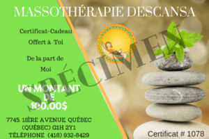 Les certificats-cadeaux de la Clinique de Massothérapie Descansa de Charlesbourg dans la région de Québec sont des présents qui ne laissent personne indifférent. Vous chercher une idée cadeau et vous êtes à la dernière minute, l’achat en ligne vous permet de la faire rapidement sans vous déplacer.